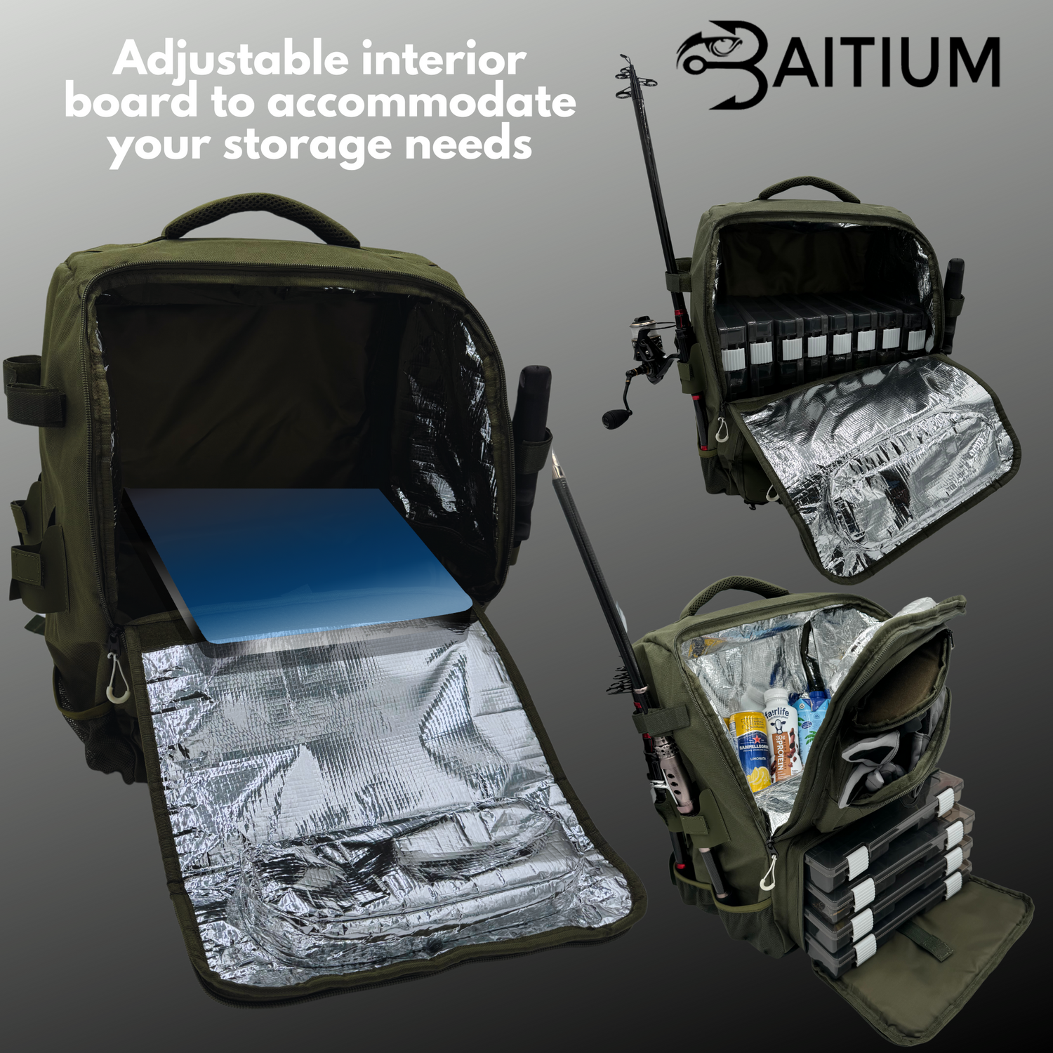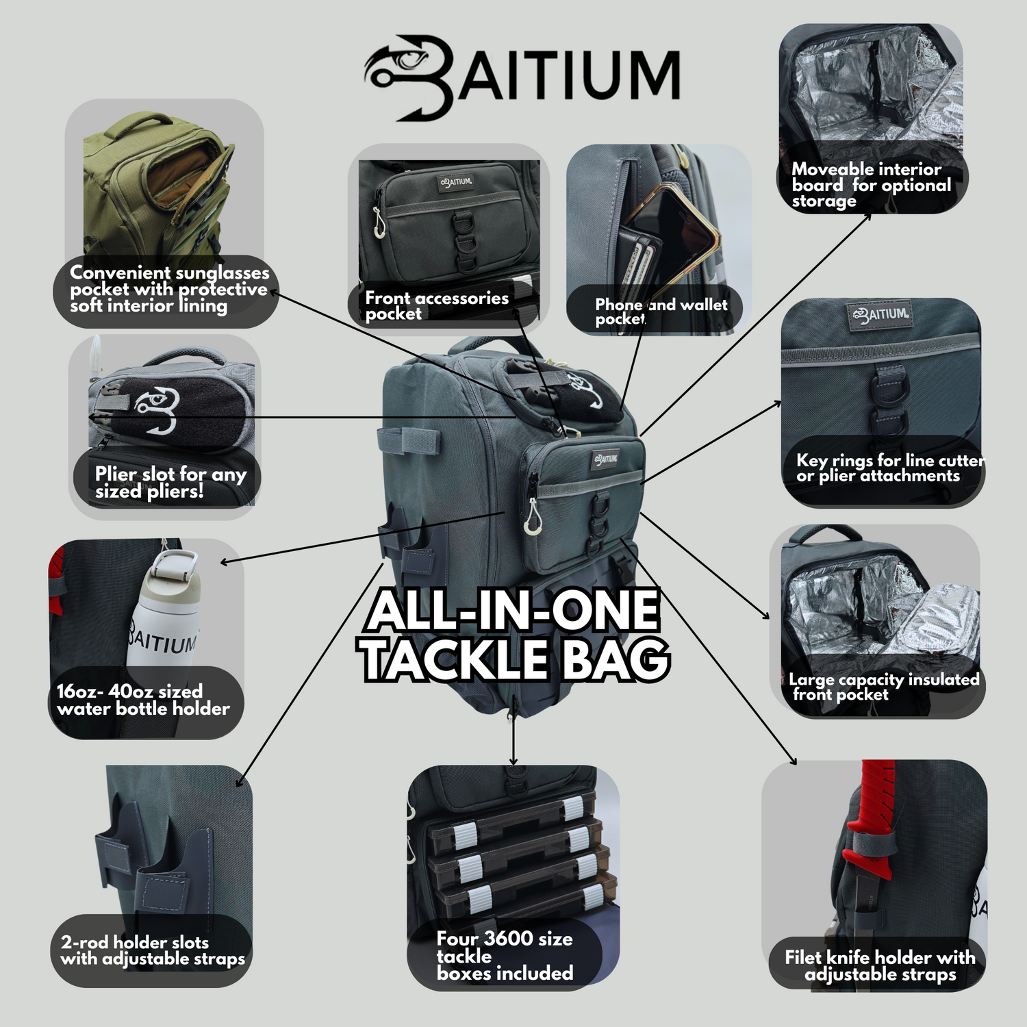 - Convenience Redefined- Elevate your fishing expeditions with Baitium’s 40L Fishing Tackle Backpack, meticulously designed for maximum convenience. This versatile backpack boasts intelligently placed rod holders, allowing for hassle-free transportation of your fishing rods. Additionally, its thoughtfully designed insulated top pocket preserves bait freshness, while the inclusion of four 3600 size tackle boxes ensures you're equipped for any angling scenario.